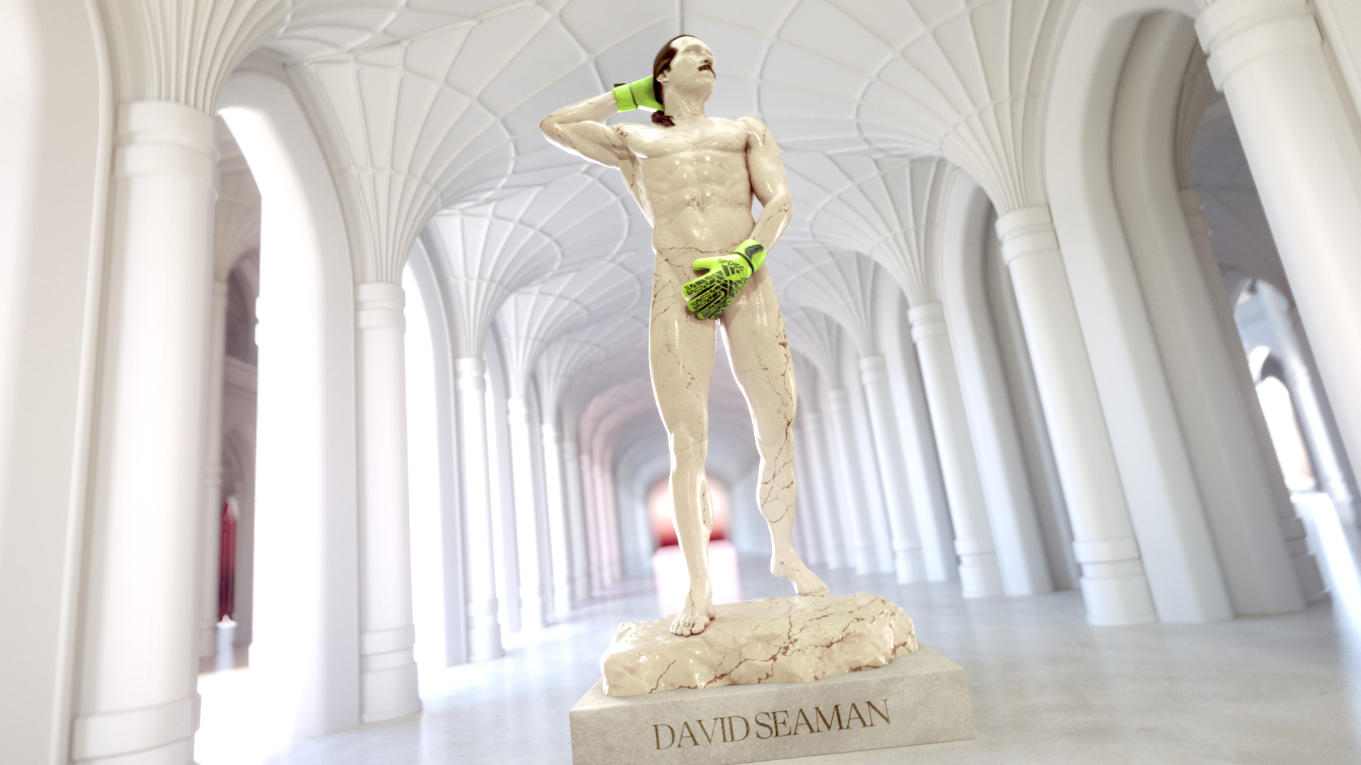And a challenge we particularly relished: creating a Michelangelo-inspired marble statue of Arsenal legend David Seaman – complete with his iconic moustache and ponytail.
