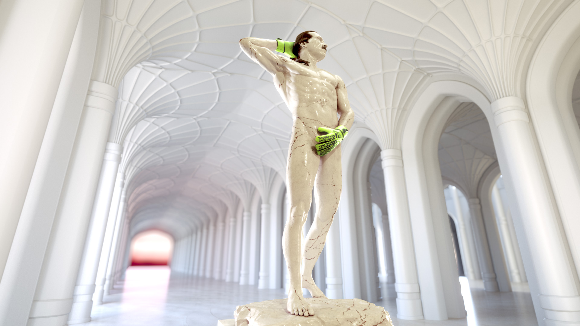 Using a basic 3d statue, we sculpted and posed Dave in ZBrush, built the gloves in Maya and posed on the hands. And we faithfully recreated Seaman’s magnificent mane and tash with XGen, an instancing tool inside Maya.