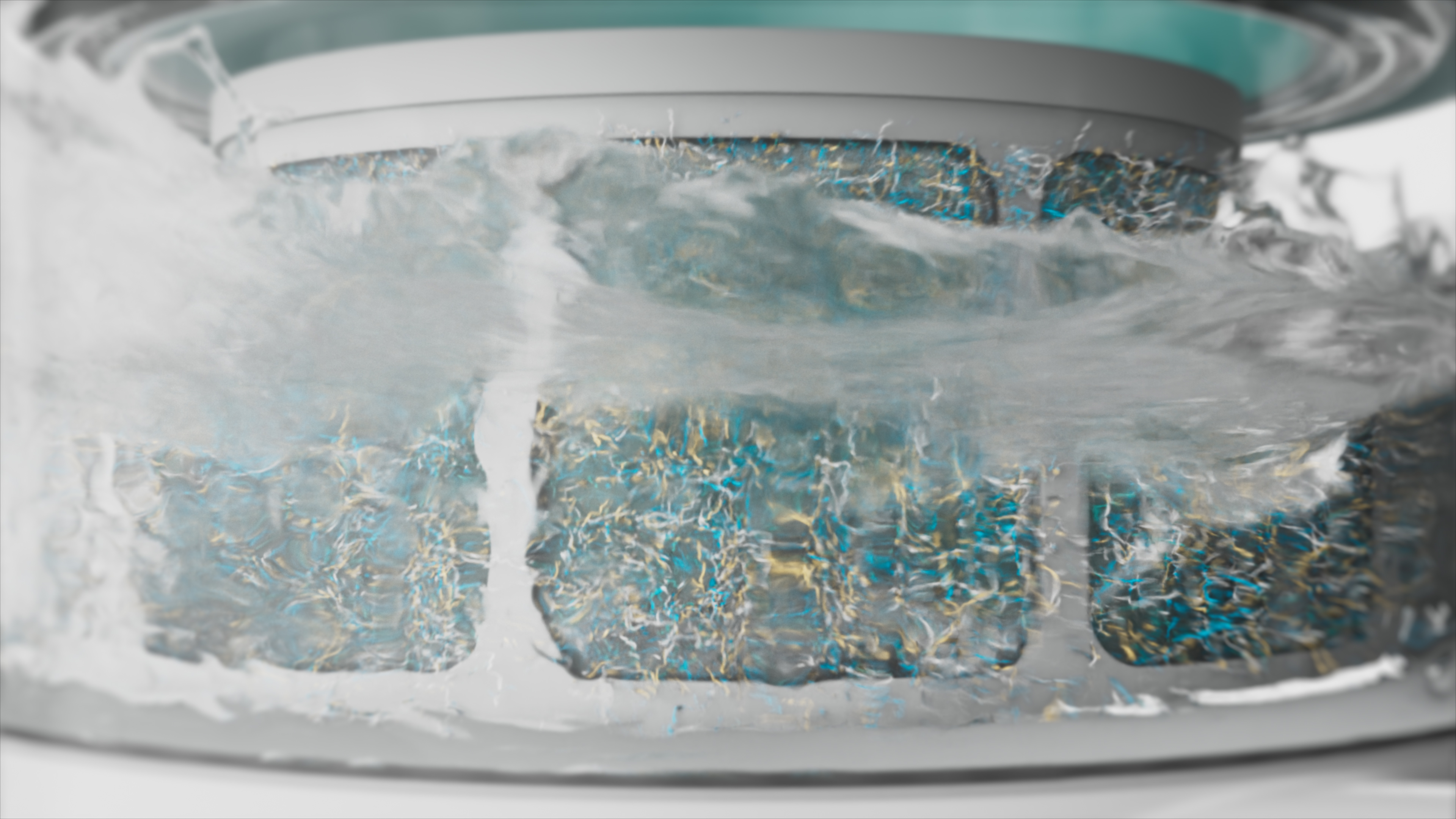 We were able to highlight specific product features that would be challenging to capture using traditional filming methods. Houdini was used for the particle and fluid simulations, illustrating how the microfibres are captured during a wash cycle, and then easily removed.