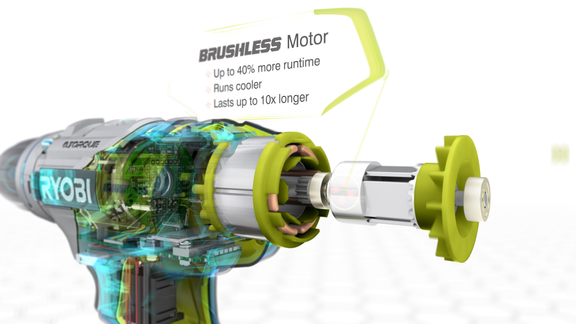 The brief was simple; deliver a high end 3d animated video highlighting the technology of the latest 18v brushless drill, to the consumer – beautifully. The focus was to communicate its cutting edge features, whilst remaining loyal and consistent to the RYOBI brand.